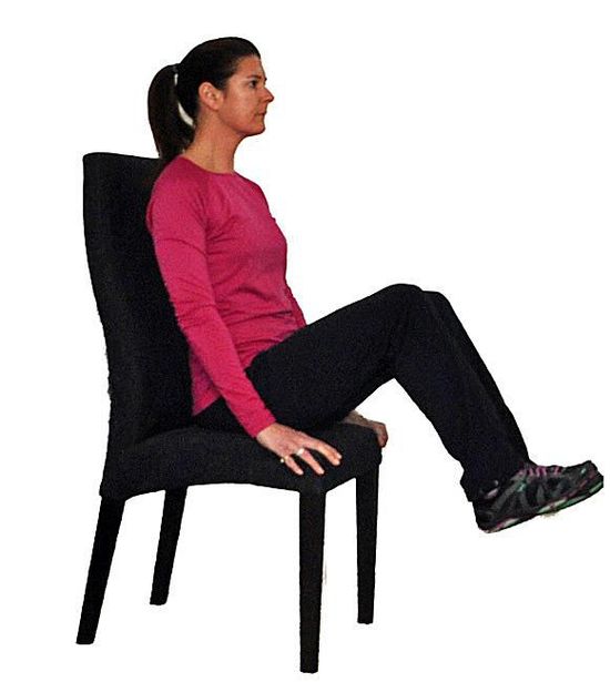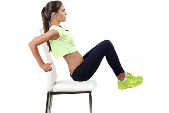 -Καθίστε στην καρέκλα και κρατήστε σφιχτά τα μπράτσα της. -Σηκώστε το σώμα από το κάθισμα, έτσι ώστε οι γοφοί και τα πόδια σας να είναι στον αέρα. -Χρησιμοποιήστε τους κοιλιακούς μυς για να φέρετε τα γόνατα στο στήθος. -Μείνετε για 15-20 δευτερόλεπτα και μετά χαμηλώστε σιγά σιγά. -Επαναλάβετε 4 φορές.