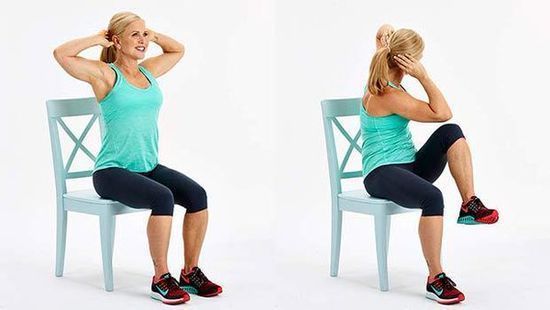-Καθίστε με την πλάτη ίσια χωρίς να ακουμπά την καρέκλα. -Βάλτε τα χέρια πίσω από το κεφάλι. -Φέρτε το δεξί γόνατο στο στήθος. -Γυρίστε και λυγίστε τον κορμό, έτσι ώστε ο αριστερός αγκώνας να ακουμπά το δεξί γόνατο. -Επιστρέψτε στην αρχική στάση και επαναλάβετε 15 φορές. -Φέρτε το αριστερό γόνατο στο στήθος και επαναλάβετε τα βήματα με τον δεξί αγκώνα. -Επιστρέψτε στην αρχική στάση και επαναλάβετε 15 φορές.