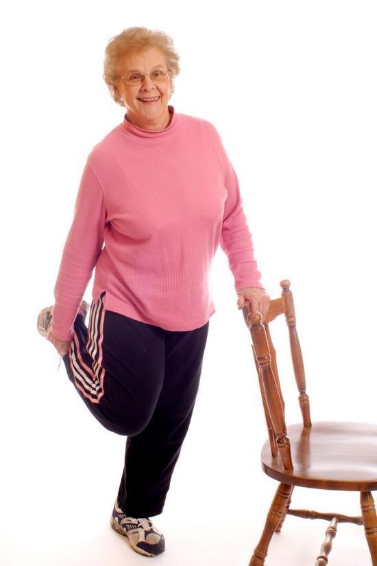 -Σταθείτε δίπλα στην καρέκλα και ακουμπήστε την με το αριστερό χέρι. -Σηκώστε το δεξί χέρι πάνω από το κεφάλι. -Σηκώστε το δεξί πόδι και λυγίστε το γόνατο, έτσι ώστε η φτέρνα να ακουμπά τον ποπό. -Χαμηλώστε σιγά σιγά το δεξί χέρι και φέρτε το στην φτέρνα. -Επιστρέψτε στην αρχική στάση και επαναλάβετε 10-15 φορές. -Αλλάξτε πόδι και επαναλάβετε την άσκηση 10-15 φορές. -Κάντε 4 σετ για κάθε πλευρά.