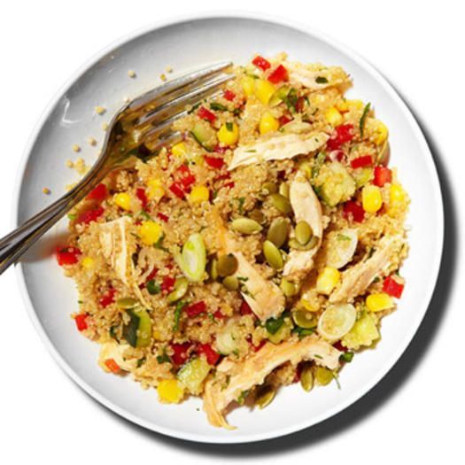 Μαγειρέψτε 1/2 φλιτζάνι ζωμό κοτόπουλου χαμηλής περιεκτικότητας σε νάτριο και 1/4 φλιτζάνι κινόα μέχρι να γίνουν al dente, περίπου για 15 λεπτά. Προσθέστε 1/4 φλιτζάνι ψιλοκομμένο αγγούρι, 1/4 φλιτζάνι σε κύβους πιπεριά κόκκινη, 1/4 φλιτζάνι καλαμπόκι, και 100γρ μαγειρεμένο τεμαχισμένο κοτόπουλο. Χτυπήστε ελαφρά μαζί 2 κουταλάκια του γλυκού ελαιόλαδο, με χυμό από 1/2 λάιμ, με 1 κουταλιά της σούπας ξύδι από κρασί ρυζιού, με 1 κουταλιά της σούπας ψιλοκομμένο κόλιαντρο,με 1 κουταλιά της σούπας ψιλοκομμένο κρεμμυδάκι, 1/2 κουταλάκι του γλυκού κύμινο, και βάλτε και μια πρέζα αλάτι και κόκκινο πιπέρι. Ρίξτε το μείγμα πάνω από τη σαλάτα και ανακατέψτε το. Πασπαλίστε από πάνω ένα κουταλάκι του γλυκού σπόρους κολοκύθας.