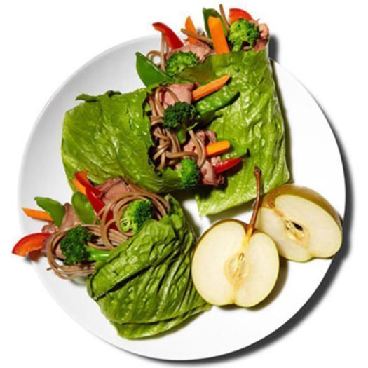 Χτυπήστε ελαφρά μαζί 2 κουταλιές της σούπας ξίδι από κρασί ρυζιού, 1/2 κουταλάκι του γλυκού πάστα τσίλι, 1 κουταλάκι του γλυκού σησαμέλαιο, το χυμό από 1/2 λάιμ, και μια πρέζα ζάχαρη και αλάτι. Αναμείξτε σε 1/4 φλιτζάνι φέτες κόκκινη πιπεριά,με 1/4 φλιτζάνι φέτες καρότο, 1/4 φλιτζάνι μπιζέλια , 1/4 φλιτζάνι ψιλοκομμένο κόλιανδρο, και 1/4 φλιτζάνι μπουκετάκια μπρόκολου. Προσθέστε 1/3 φλιτζάνι μαγειρεμένα γιαπωνέζικα ζυμαρικά soba και 1 κουταλιά της σούπας ψιλοκομμένο φιστίκια; ανακατέψτε το. Χωρίστε το σε τρεις μερίδες και τοποθετήστε το καθένα σε 1 φύλλο μαρουλιού τύπου Romaine και ολοκληρώστε τη γέμιση με 30γρ άπαχο βοδινό κρέας ψητό. Τυλίξτε τα κάνοντας τα ένα ρολό. Συνοδεύστε το με 1 μικρό αχλάδι.