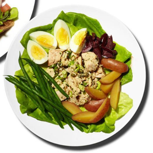 Ανακατέψτε 115gr τόνο σε κονσέρβα, ξεπλένοντας το και αποστραγγίζοντας το, με 1 κουταλάκι του γλυκού κάπαρη, 1 κουταλάκι του γλυκού ελαιόλαδο, 1 κουταλάκι του γλυκού ψιλοκομμένο φρέσκο μαϊντανό , 1 κουταλάκι του γλυκού ψιλοκομμένα κρεμμυδάκια, και 1 κουταλάκι του γλυκού χυμό λεμονιού. Βάλτε 1 φλιτζάνι μαρούλι Boston στο τόνο και 1 βραστό αυγό τεμαχισμένο, 1/2 φλιτζάνι μαγειρεμένες baby πατάτες, 1/2 φλιτζάνι πράσινα φασόλια και 2 κουταλιές της σούπας τεμαχισμένες ελιές Καλαμών.