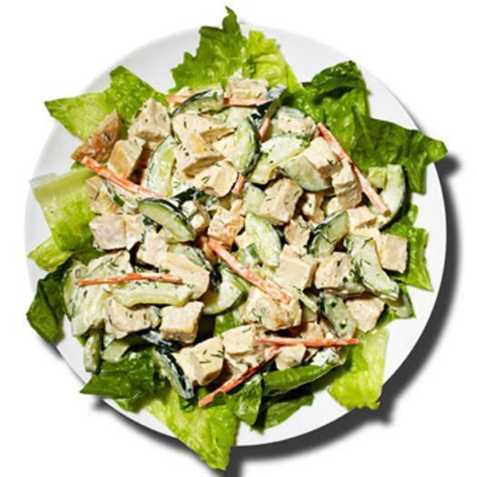 Συνδυάστε 3 κουταλιές της σούπας άπαχο ελληνικό γιαούρτι, 1/2 κουταλάκι του γλυκού μουστάρδα, 1 κουταλάκι του γλυκού χαμηλής περιεκτικότητας σε λιπαρά μαγιονέζα, 2 κουταλιές της σούπας ψιλοκομμένο σέλινο, 1/2 μέτριο καρότο ψιλοκομμένο, 1 κουταλιά της σούπας ψιλοκομμένο μαϊντανό και 1 κουταλιά της σούπας ψιλοκομμένο σχοινόπρασο. Προσθέστε 1 φλιτζάνι ψιλοκομμένο μαγειρεμένο κοτόπουλο. Χτυπήστε ελαφρά μαζί 1 φλιτζάνι φέτες με αγγούρι, μια πρέζα αλάτι, 1/4 κουταλάκι ζάχαρη, 2 κουταλιές της σούπας άσπρο ξίδι, 1/2 κουταλάκι του γλυκού λάδι canola και 1 κουταλάκι του γλυκού ψιλοκομμένο φρέσκο άνηθο.Η σαλάτα αυτή σερβίρετε πάνω από 1 φλιτζάνι ψιλοκομμένο μαρούλι.