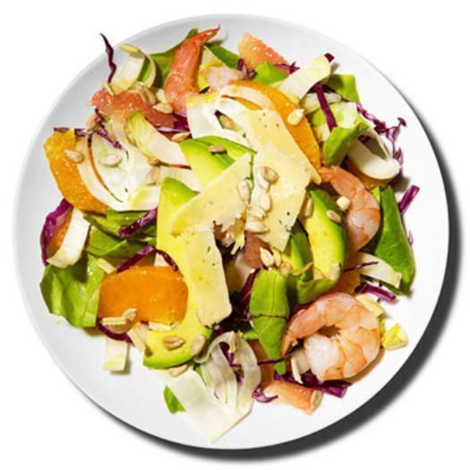 Σοτάρουμε 88γρ γαρίδες με 1 σκελίδα σκόρδο ψιλοκομμένη, και 1 κουταλιά της σούπας χυμό λεμονιού σε ένα τηγάνι με επικάλυψη από αντικολλητικό σπρέι μαγειρικής . Συνδυάστε 1/3 φλιτζάνι ψιλοκομμένο BIBB μαρούλι, 1/2 φλιτζάνι ψιλοκομμένο αντίδι, 1/2 φλιτζάνι ψιλοκομμένο κόκκινο λάχανο, και 1/2 φλιτζάνι ψιλοκομμένο μάραθο. Συλλέξτε το χυμό από 1/2 πορτοκάλι και 1/2 ροζ γκρέιπφρουτ. Καθαρίστε και κόψτε τα υπόλοιπα φρούτα σε κομμάτια. Χτυπήστε ελαφρά μαζί το 1/2 κουταλάκι του γλυκού ελαιόλαδο και το χυμό από τα εσπεριδοειδή και ανακατέψτε με ανάμεικτα λαχανικά με 1/3 αβοκάντο, κομμένο σε φέτες,τις γαρίδες και τα τμήματα των εσπεριδοειδών. Στο τέλος πασπαλίστε 2 κουταλάκια του γλυκού ξύσμα παρμεζάνας και 2 κουταλάκια του γλυκού σπόρους ηλιάνθου.