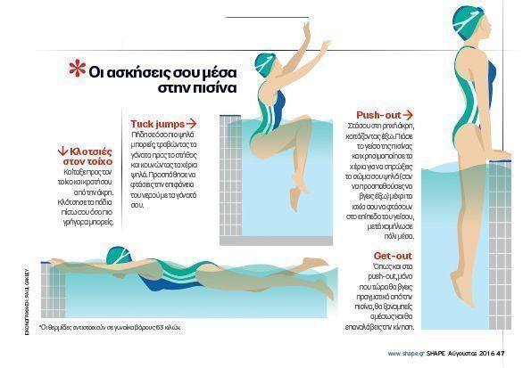 Όπως και στο push-out, μόνο που τώρα θα βγεις πραγματικά από την πισίνα, θα ξαναμπείς αμέσως και θα επαναλάβεις την κίνηση. *Οι θερμίδες αντιστοιχούν σε γυναίκα βάρους 63 κιλών.
