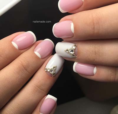 Και βέβαια δεν πρέπει να ξεχνάμε το αγαπημένο γαλλικό μανικιούρ σε κοντά νύχια. Πρόκειται για ένα σχέδιο ιδανικό για κάθε περίσταση που κάνει τα κοντά νύχια να φαίνονται μακρύτερα, αφού η γραμμή στην κορυφή του νυχιού δημιουργεί την ψευδαίσθηση πως επιμηκύνεται. Προσοχή όμως στο πάχος της γραμμής που θα σχεδιάσετε. Δεν πρέπει να είναι ούτε πολύ λεπτή, ούτε πολύ χοντρή, διότι θα πετύχετε το αντίθετο αποτέλεσμα.