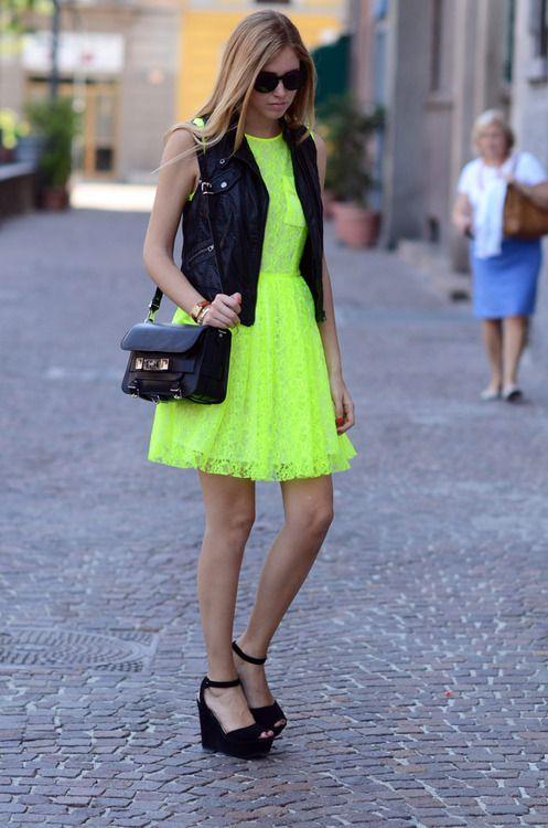 Ακόμη και με τους φωσφοριζέ χρωματισμούς μπορείς να δημιουργήσεις ένα πιο rock outfit, αν αυτό είναι το στυλ που αγαπάς. Φόρεσε το αγαπημένο σου φωσφοριζέ φόρεμα και πρόσθεσε ένα καλοκαιρινό μαύρο jacket. Let’s rock & roll!