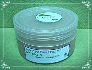 Στη φωτογραφία βλέπετε μια κρέμα σώματος με έλαιο κολοκύθας, βούτυρο κακάο και βούτυρο καριτέ που περιέχει μαγνήσιο. Η κρέμα αυτή απαλύνει τα συμπτώματα του συνδρόμου ανήσυχων ποδιών, έχει αναλγητική δράση και αφήνει το δέρμα βελούδινο. Με αιθέρια έλαια μαστίχα, κυπαρίσσι, γιασεμί