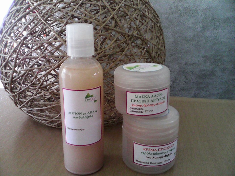 Στη φωτογραφία βλέπετε μια ολοκληρωμένη σειρά προϊόντων, που αποτελείται από λοσιόν καθαρισμού με οξέα φρούτων, μάσκα με αλόη και πράσινη άργιλο και ανάλαφρη κρέμα προσώπου με νερόλι& κόκκινο σταφύλι, για δέρμα με ακμή, φτιαγμένα αποκλειστικά για μια πελάτισσα!