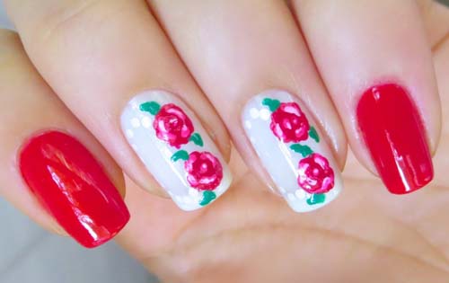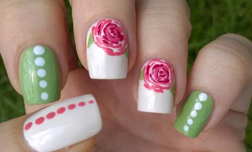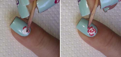 Αφού βάψετε τα νύχια σας με το χρώμα βάσης που επιθυμείτε, σχεδιάστε με λευκό βερνίκι μια μεγάλη και όχι εντελώς στρογγυλή βούλα. Με την βοήθεια της οδοντογλυφίδας και ενός χρώματος μανό αρχίστε να σχεδιάζετε μικρές γραμμούλες όπως βλέπετε στην εικόνα για να ζωγραφίσετε το τριαντάφυλλο σας. Στη συνέχεια σχεδιάστε τα πέταλα από το περίγραμμα προς το κέντρο και το αποτέλεσμα θα σας εντυπωσιάσει.