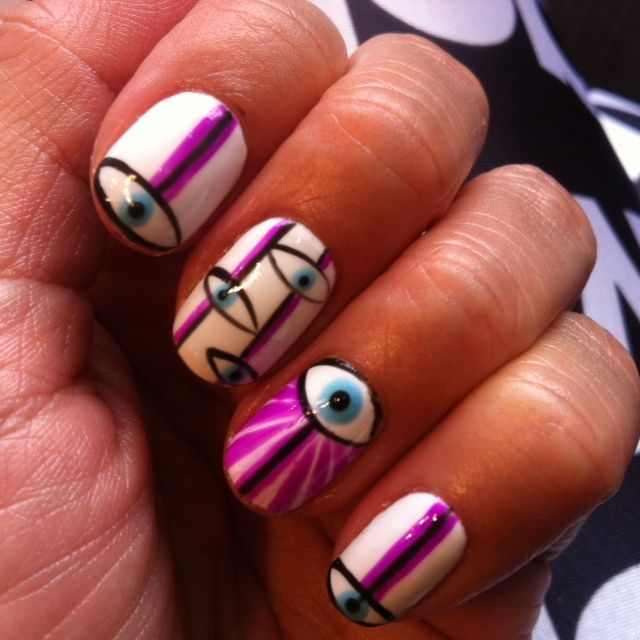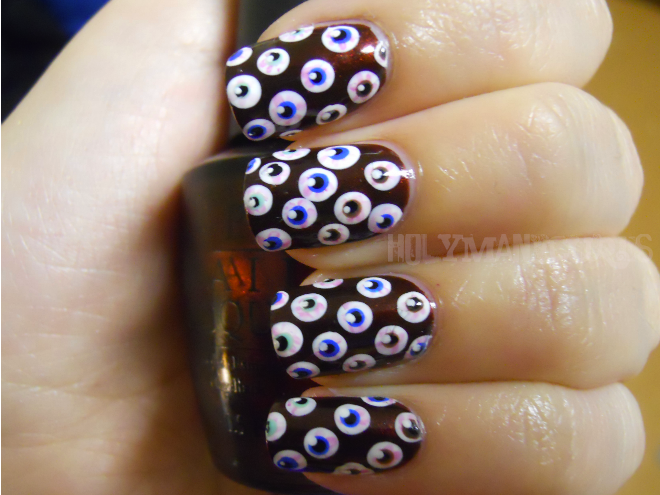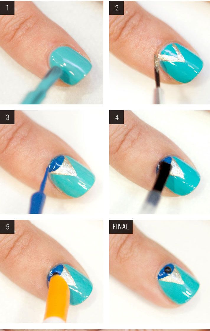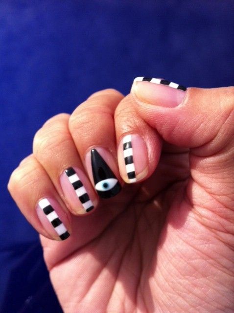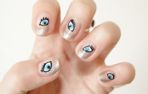 Κατ ‘αρχάς, χρησιμοποιήστε nude χρώμα για την βάση του μανικιούρ σας.Αφήστε το βερνίκι να στεγνώσει εντελώς, και στη συνέχεια χρησιμοποιήστε τις ειδικές ταινίες για να δώσετε ένα οβάλ σχήμα..Χρωματίστε το εκτεθειμένο οβάλ με το λευκό βερνίκι, αφήστε το να στεγνώσει εντελώς, και σιγά-σιγά αφαιρέστε την ταινία. Μόλις το λευκό έχει στεγνώσει, κόψτε τις ταινίες στη μέση και ανοίξτε μικρές τρύπες στο κέντρο. Χρησιμοποιήστε το γαλάζιο βερνίκι σας πάνω στην τρύπα. Αφήστε το βερνίκι να στεγνώσει εντελώς και αφαιρέστε τις ταινίες. Χρησιμοποιήστε μαύρο μαρκαδόρο ή μανό για να ταμπονάρετε μια μικρή κουκκίδα σε κάθε κέντρο των ματιών. Μόλις το μαύρο στεγνώσει, να τελειώστε το μανικιούρ σας με to Top coat.