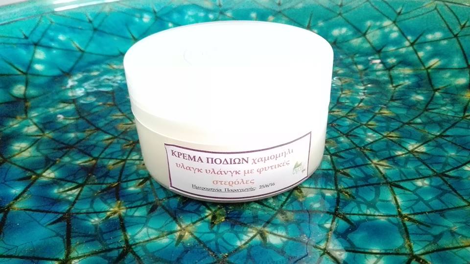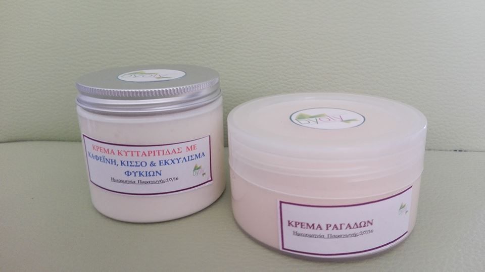 Στις φωτογραφίες βλέπετε κρέμα ποδιών με βούτυρο καριτέ και αιθέρια έλαια υλανγκ υλανγκ και χαμομήλι, την διάσημη κρέμα κυτταρίτιδας με καφεϊνη, εκχύλισμα κισσού και βούτυρο καριτέ φυσικά, σε συνδυασμό με το σκραμπ κυτταρίτιδας με πολίτιμα βούτυρα και αλάτι Μεσολογγίου αλλά και τη μοναδική κρέμα ραγάδων, η οποία μπορεί να γίνει ειδικά και για εγκύους.