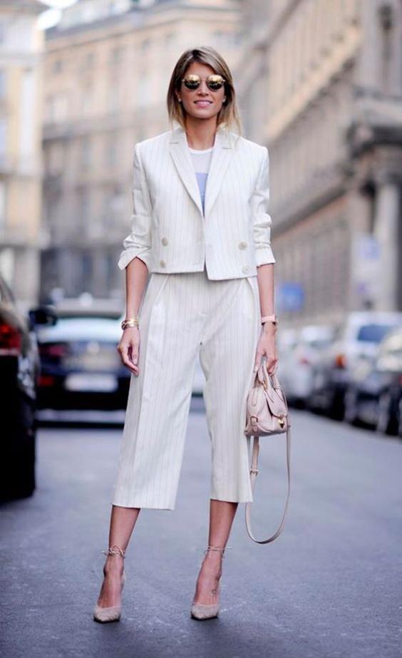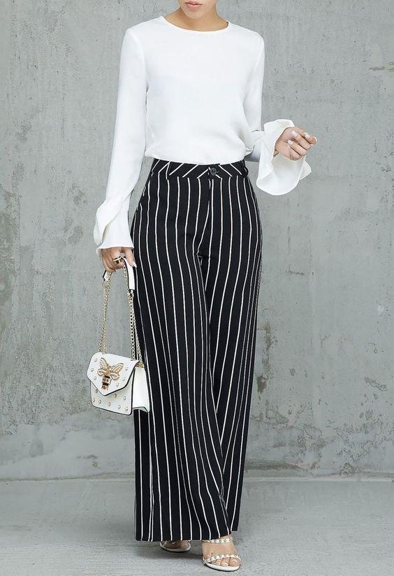 Είσαι καλεσμένη σε κάποιον γάμο, βάφτιση ή κάποια άλλη επίσημη κοινωνική δεξίωση. Το παρακάτω outfit είναι ακριβώς αυτό που χρειάζεσαι. Ένα look du jour παντελόνι με ρίγες και μια επίσημη λευκή μπλούζα με έντονα μανίκια μπορούν να τελειοποιήσουν το επίσημο outfit σου.