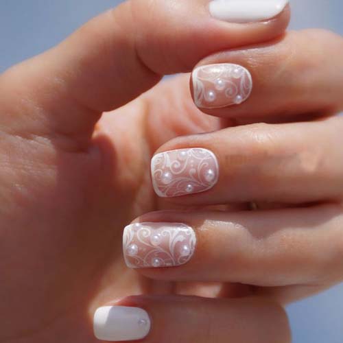 Nude νυφικά νύχια με διακοσμητικές πέρλες και σχέδια λευκής δαντέλας
