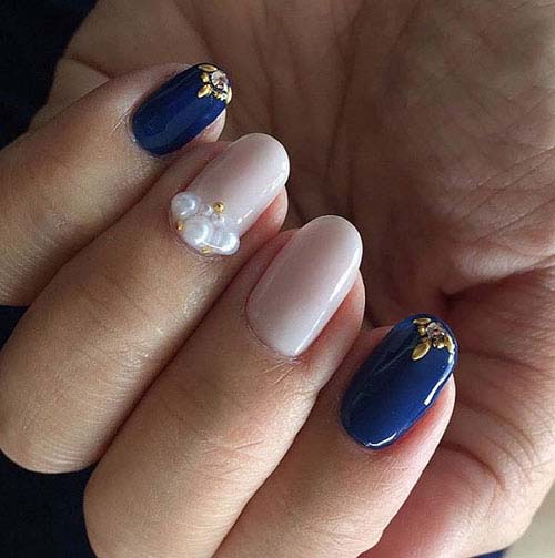 Μπλε και γαλακτερά νύχια με μεταλλικές λεπτομέρειες και πέρλες