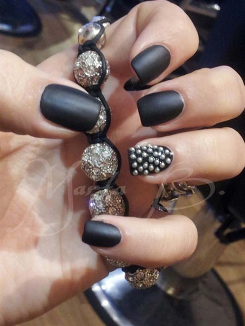 Μαύρα ματ νύχια με διακοσμητικές πέρλες στο ένα