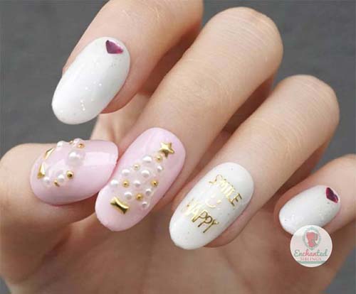Χριστουγεννιάτικο σχέδιο νυχιών με πέρλες που σχηματίζουν δένδρο σε λευκή και ροζ βάση