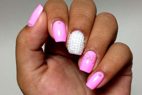 Ροζ έντονο μανικιούρ με λευκές και ροζ πέρλες