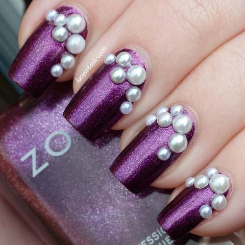 Μωβ μεταλλικό μανικιούρ με πέρλες στην βάση των νυχιών