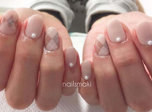 Μπεζ νύχια με σχέδια ρόμβων και πέρλες