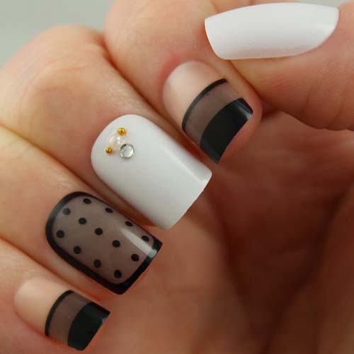 Νύχια με μαύρο, μπεζ και λευκό βερνίκι, διακοσμημένα με πέρλα και στρας