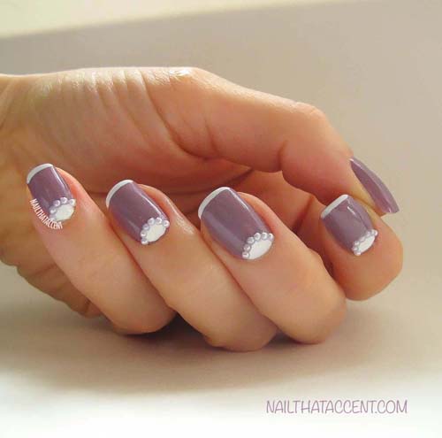 Half moon γαλλικό μανικιούρ με μωβ βάση και πέρλες