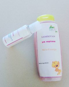 Στη φωτογραφία βλέπετε παιδικό σαμπουάν και κοντίσιονερ με υλικά που σέβονται τα παιδικά μαλλάκια, όπως η βιταμίνη Β5 και το γάλα αμυγδάλου.