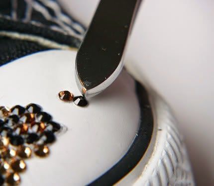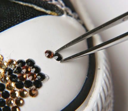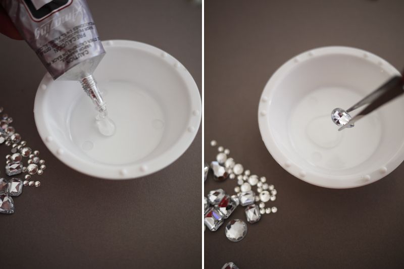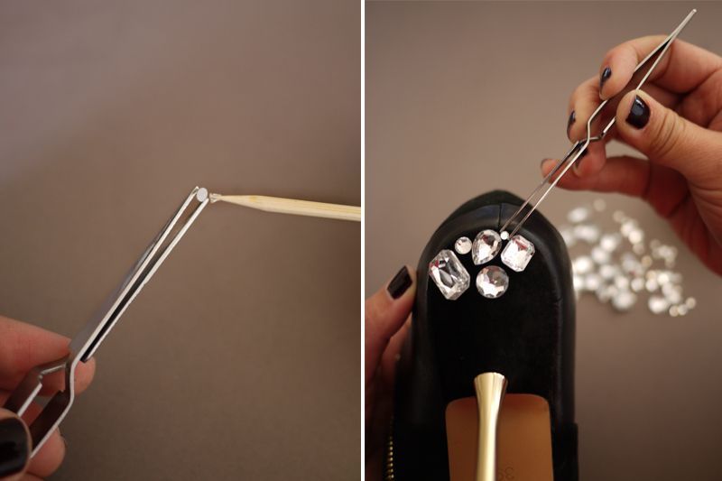 Βαλτε λίγη κόλλα μέσα σε ένα πιατο. Πιάστε με το τσιμπιδάκι το στρασακι και Βάλτε κολλά στην οδοντογλυφιδα.Κολληστε το στρας στο παπούτσι.