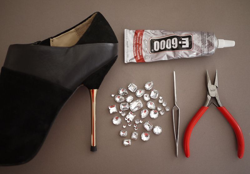 – Ένα ζευγάρι ψηλοτάκουνες γόβες ή booties – Λαμπερές πέτρες σε διαφορετικά μεγέθη και σχήματα – Δυνατή κόλλα – Ένα τσιμπιδάκι για τα φρύδια – Ένα μικρό πενσάκι – Μια οδοντογλυφίδα και – Ένα πλαστικό πιάτο