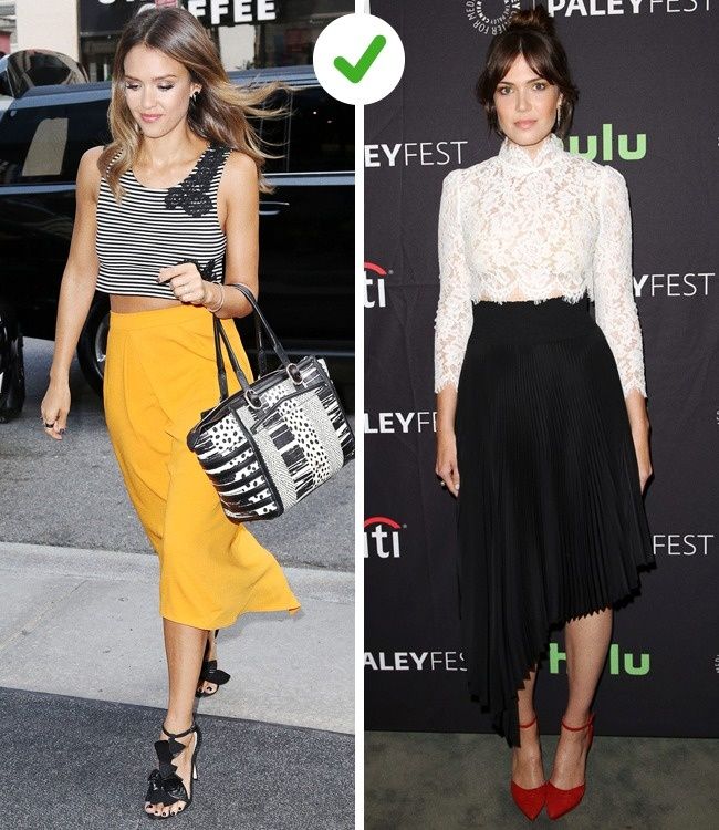 Το ίδιο ισχύει και για τις φούστες: είναι αναμφισβήτητα ωραίες, αλλά μόνο αν είστε έφηβες. Όπως μπορείτε να δείτε, δεν ταιριάζουν ούτε στη Jessica Alba. Είναι πολύ καλύτερα να τις αντικαταστήσετε με κοντές φούστες σε A-γραμμή. Και αν δεν έχετε τη διάπλαση ενός μοντέλου, είναι καλύτερα το πάνω μέρος της φούστας να ορίζει τους γοφούς, ώστε να μην προσθέτει επιπλέον κιλά.