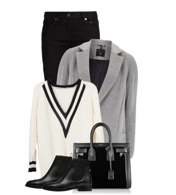 Αυτό το ντύσιμο είναι καθημερινό και κομψό. Περιλαμβάνει κολλητό μαύρο τζιν, ανοιχτό γκρι blazer, πουλόβερ V και μαύρα φλατ μποτάκια.