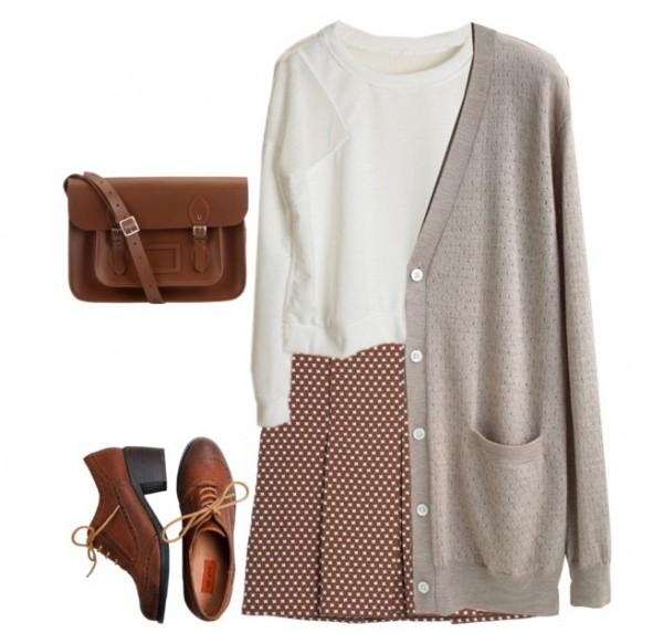 Το ρετρό στυλ δεν θα μπορούσε να λείπει. Το σύνολο περιλαμβάνει ένα λευκό πουλόβερ συνδυασμένο με μια ανοιχτόχρωμη γκρι υφασμάτινη ζακέτα, φούστα με βούλες, καφέ ανδρόγυνα παπούτσια και καφέ τσάντα.