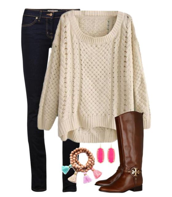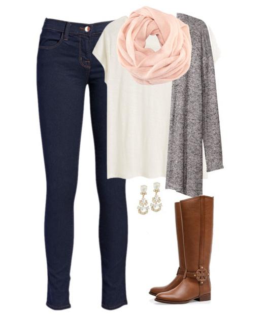 Το σύνολο αυτό είναι για πιο καθημερινές εμφανίσεις και περιλαμβάνει ένα μπλε σκούρο παντελόνι τζιν, ένα λευκό φαρδύ μπολουζάκι, μια γκρι ζακέτα, ανοιχτό ροζ κασκόλ και μπότες σε καφέ χρώμα.