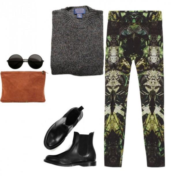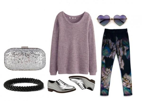 Το σύνολο είναι για τα άτομα που τους αρέσει το διαφορετικό. Περιλαμβάνει γυαλιά ηλίου σε σχήμα καρδιάς, παντελόνι με σχέδια, ανοιχτό μωβ πουλόβερ, μεταλλικό τσαντάκι και μεταλλικά ανδρόγυνα παπούτσια.
