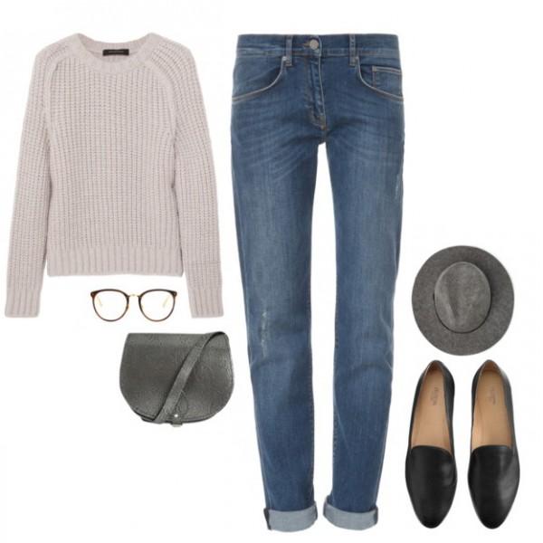 Αυτό είναι ένα πολύ άνετο σύνολο που περιλαμβάνει πλεκτό πουλόβερ, τζιν γυρισμένο, καπέλο γκρι σε ανδρικό στυλ, και δερμάτινες μαύρες μπαλαρίνες.