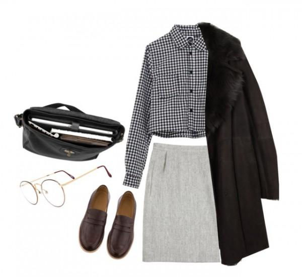Δοκιμάστε αυτό το ενδιαφέρον σύνολο για το γραφείο! Περιλαμβάνει, ένα μαύρο παλτό με μαύρο / άσπρο καρό πουκάμισο, ανοιχτό γκρι φούστα, καφέ φλατ παπούτσια και στρογγυλεμένα γυαλιά ηλίου.