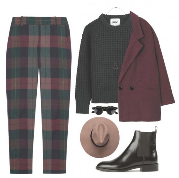 Ένα ακόμη υπέροχο καθημερινό σύνολο που περιλαμβάνει καρό παντελόνι, μαύρο πουλόβερ, μπορντώ πανωφόρι, φλατ μποτάκια και μάλλινο καπέλο σε ανδρικό στυλ