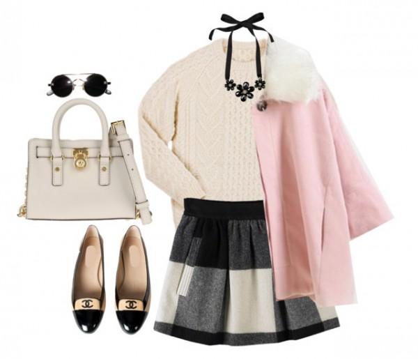 Στις γυναίκες που αρέσουν τα πιο κοριτσίστικα ρούχα και τα πιο χαριτωμένα μπορούν να επιλέξουν αυτό το σύνολο που περιλαμβάνει ανοιχτό ροζ παλτό με λευκό κολάρο γούνας, λευκό πλεκτό πουλόβερ κολιέ με λουλούδια, μάλλινη καρό κοντή φούστα, τσάντα γεωμετρικού σχήματος, ρετρό εμπνευσμένα στρογγυλά γυαλιά ηλίου και γυαλιστερές φλατ μπαλαρίνες.