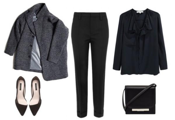 Ένα ακόμη υπέροχο σύνολο για το γραφείο που περιλαμβάνει, μαύρη μπλούζα με φρου φρου στο γιακά, καλό μαύρο παντελόνι, ένα γκρι πανωφόρι, και μαύρα τακούνια.