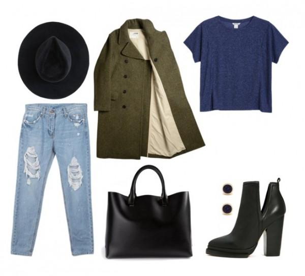 Αυτό το σύνολο είναι πιο καθημερινό. Περιλαμβάνει ένα καπέλο σε ανδρικό στυλ, μάλλινο χακί παλτό, ένα κοντομάνικο μπλουζάκι, κομψά μαύρα δερμάτινα μποτάκια, ματ μαύρη τσάντα και σκισμένο τζιν.