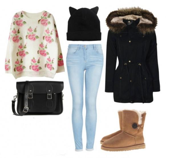 Το σύνολο αυτό είναι εμπνευσμένο από το σχολείο. Περιλαμβάνει κασκόλσκουφάκι με αυτιά γάτας, ανοιχτό γαλάζιο τζιν, μαύρο μπουφάν με γούνινη κουκούλα, λεπτό πουλοβεράκι με τριαντάφυλλα, Uggs μποτάκια και μαύρη τσάντα.