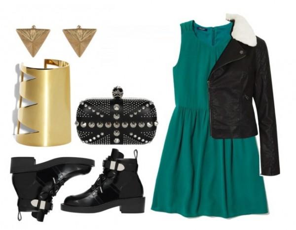 Αν θέλετε ένα πιο θηλυκό ντύσιμο, συνδυάστε σκούρο τυρκουάζ φόρεμα, με μοντέρνα αξεσουάρ, μποτάκια και με ένα δερμάτινο μπουφάν.
