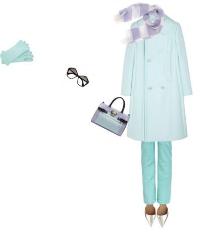 Το σύνολο αυτό είναι κομψό και αριστοκρατικό. Περιλαμβάνει ανοιχτό μπλε παλτό, ανοιχτό μπλε παντελόνι, μυτερό μεταλλικό παπούτσι, φουλάρι, τσάντα μινιατούρα, γυαλιά ηλίου και απαλό μπλε γάντια.