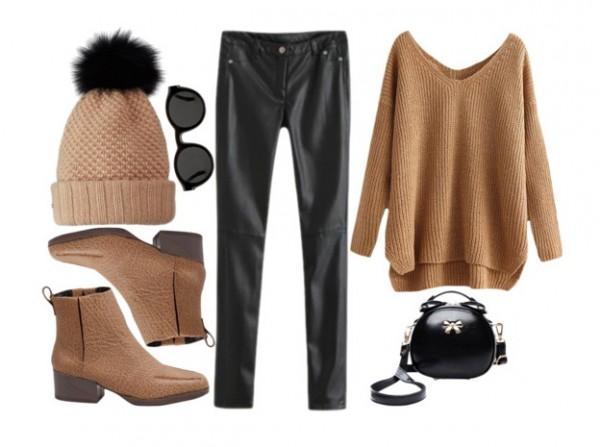 Το σύνολο αυτό περιλαμβάνει ενδιαφέρον κομμάτια όπως ένα πλεκτό σκουφάκι με γούνα, δερμάτινο μαύρο παντελόνι, χαλαρό πουλόβερ με V-λαιμό σε καφετί χρώμα , ρετρό εμπνευσμένη γυαλιστερή μαύρη τσάντα ώμου , στρογγυλεμένα γυαλιά ηλίου με μαύρους φακούς και σκελετό, καθώς και δερμάτινα χαμηλά μποτάκια καφετί .