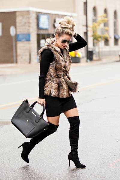 Υπάρχει βέβαια πάντα και η επιλογή ενός κολλητού μίνι φορέματος. Το συγκεκριμένο φουστάνι συνδυάζεται όμορφα με ένα γούνινο γιλέκο. Πρόκειται για ένα εντυπωσιακό φθινοπωρινό σύνολο ιδανικό για τις βραδινές σας εξόδους. Ολοκληρώστε το με μπότες πάνω από το γόνατο και θα κλέψετε τις εντυπώσεις.