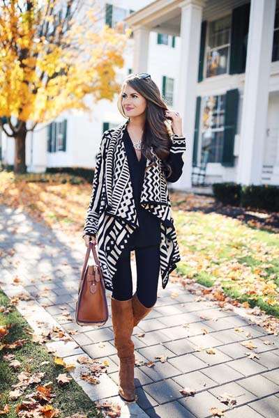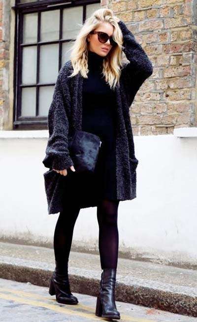 Εξίσου εντυπωσιακό είναι και το ροκ casual σύνολο με κοντό πλεκτό φόρεμα, φαρδιά πλεκτή ζακέτα και αρβυλάκια.