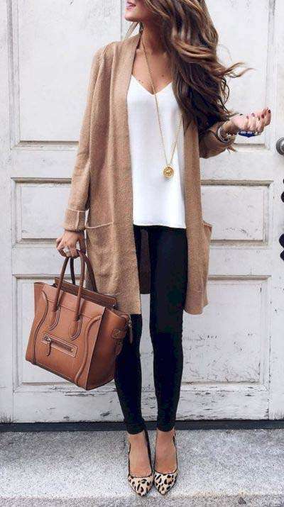 Εξίσου όμορφο καθημερινό φθινοπωρινό ντύσιμο γραφείου είναι όμως και αυτό που συνδυάζει το χρωματιστό παντελόνι, ακόμη και σε σχέδιο φόρμας, με ένα απλό μπλουζάκι και μια μακριά ζακέτα. Αν μάλιστα το φορέσετε με ένα ζευγάρι γόβες, τότε πρόκειται μια εντυπωσιακή ιδέα ρούχου για τη δουλειά.