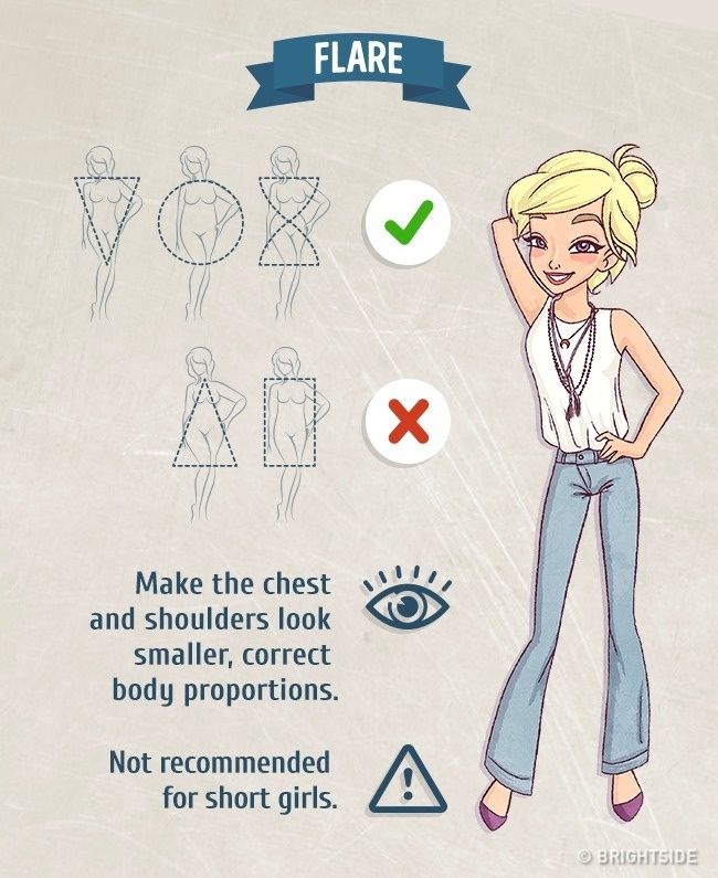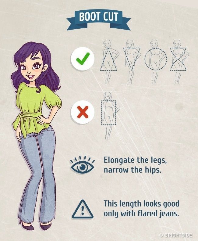 Τα τζιν με καμπάνα, δεν πρέπει να προτιμώνται από τις γυναίκες με τρίγωνο ή ορθογώνιο σωματότυπο. Κάνουν το στήθος και τους ώμους να δείχνουν μικρότερα, αλλά δεν πρέπει να φοριούνται από κοντές γυναίκες.