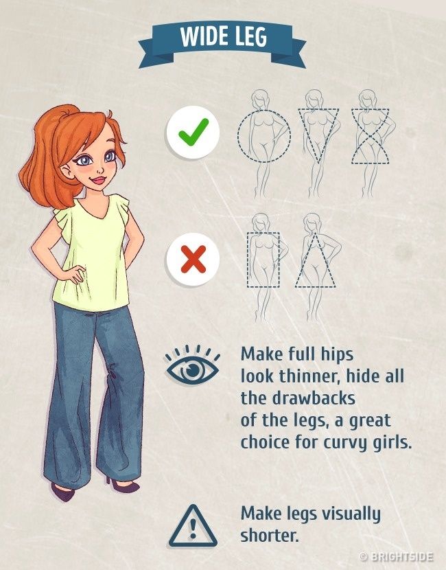 Τα τζιν πολύ φαρδιά στα πόδια, δεν πρέπει να προτιμώνται από τις γυναίκες με τρίγωνο ή ορθογώνιο σωματότυπο. Καλύπτουν την περιφέρεια, αδυνατίζοντάς την, ότι πρέπει για γυναίκες με καμπύλες. Κάνουν όμως τα πόδια, να φαίνονται πιο κοντά.