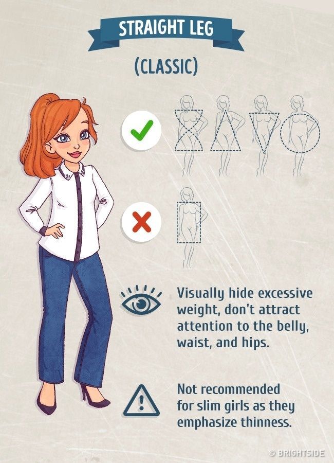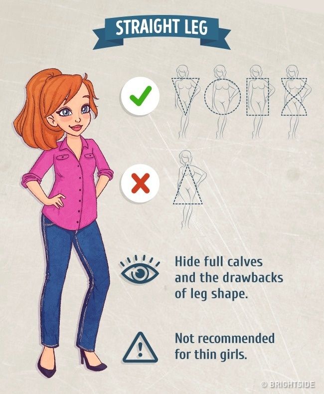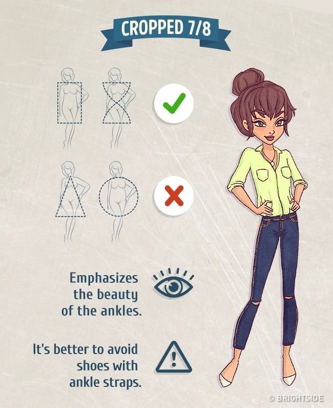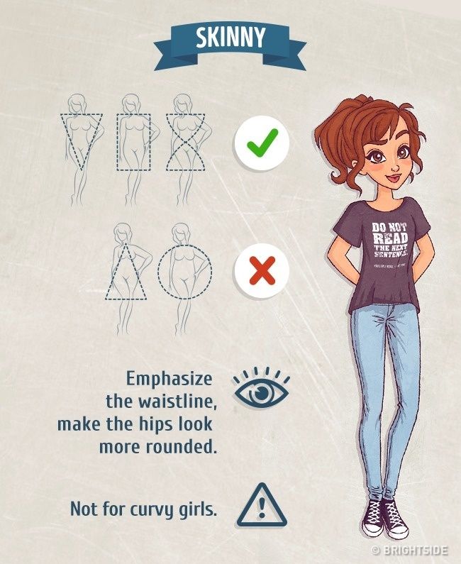Τα skinny τζιν που έρχονται ως τον αστράγαλο και έρχονται σε ευθεία γραμμή στα πόδια, δεν πηγαίνουν στα κορίτσια με τριγωνικό σώμα. Κρύβουν τις καμπύλες, αλλά τα πολύ αδύνατα κορίτσια πρέπει να τα αποφεύγουν.